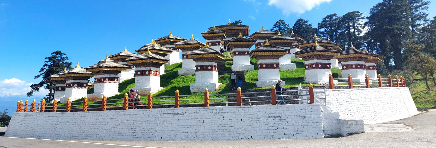 At Dochula Pass, 108 chortens or stupas known as Druk Wangyal Chortens have been built by Ashi Dorji Wangmo Wangchuk, the eldest Queen Mother. Also visit at Dochula pass Druk Wangyal Lhakhang (temple), built in honour of His Majesty the fourth Druk Gyalpo, Jigme Singye Wangchuck.